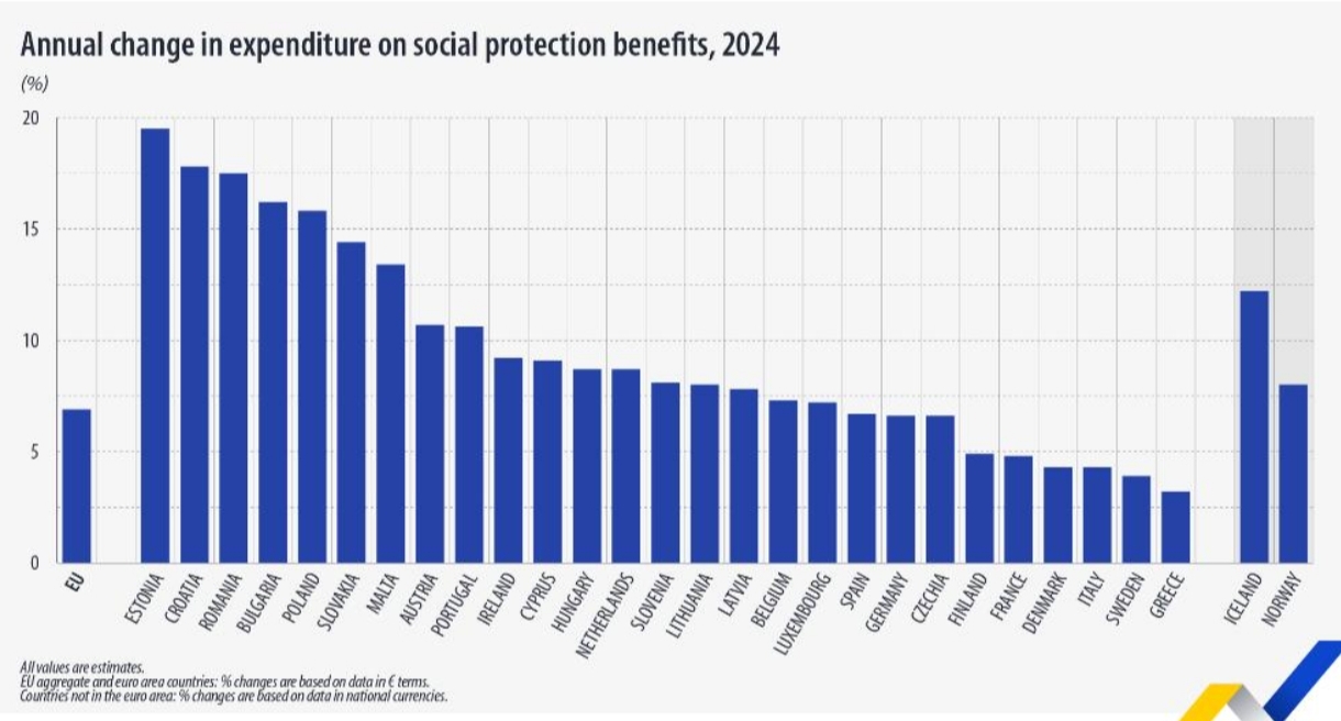 В 2024 году расходы на пособия по социальной защите выросли во всех странах ЕС. Самый значительный рост по сравнению с 2023 годом был зафиксирован в Эстонии (+19,5%), Хорватии (+17,8%) и Румынии (+17,5%), в то время как наименьший рост был зарегистрирован в Греции (+3,2%), Швеции (+3,9%) и в Италии и Дании (по +4,3% в каждой).