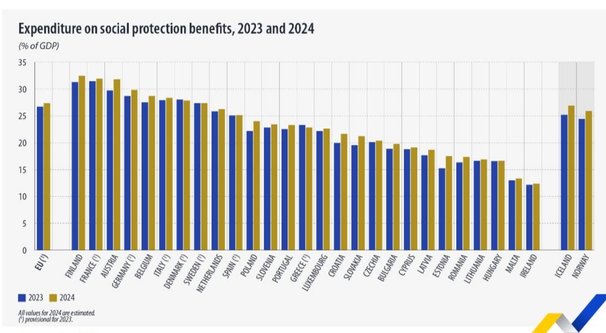 Данные показывают, что расходы на пособия по социальной защите составили 27,3% от ВВП ЕС, увеличившись на 0,6 процентных пункта по сравнению с предыдущим годом. Среди стран ЕС доля расходов на социальную защиту в ВВП была самой высокой в Финляндии (32,5% от ВВП), Франции (31,9%) и Австрии (31,8%), а самой низкой — в Ирландии (12,4%), на Мальте (13,4%) и в Венгрии (16,6%).