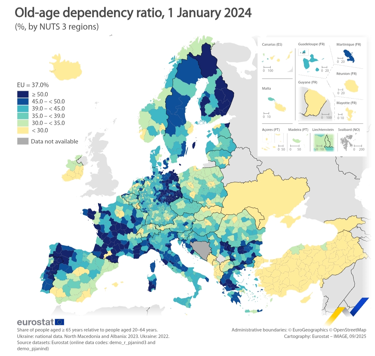 По состоянию на январь 2024 года насчитывалось 139 регионов по Номенклатуре территориальных единиц для статистики (NUTS 3), где коэффициент демографической нагрузки по старости составлял не менее 50%. Эта группа регионов была в основном сосредоточена в (восточной) Германии и Франции. Кроме того, Италия, Финляндия, Португалия, Болгария, Греция и Испания также имели по несколько регионов, где коэффициент демографической нагрузки по старости составлял не менее 50%.
