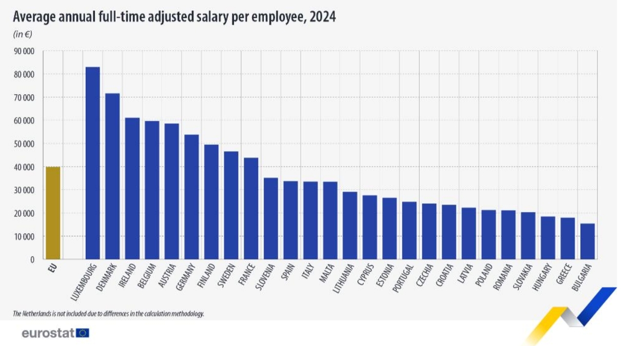 Среди государств-членов ЕС самые высокие средние годовые скорректированные зарплаты были зафиксированы в Люксембурге (83 000 евро), за которым следуют Дания (71 600 евро) и Ирландия (61 100 евро).