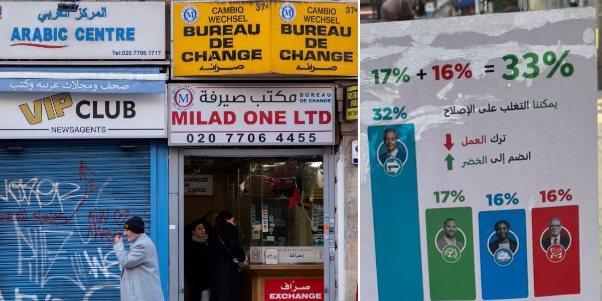 Плакат, призывающий арабоязычных избирателей голосовать за Партию зелёных, чтобы не допустить победы Найджела Фараджа на следующих всеобщих выборах, появился на Эджвер-роуд в Лондоне.