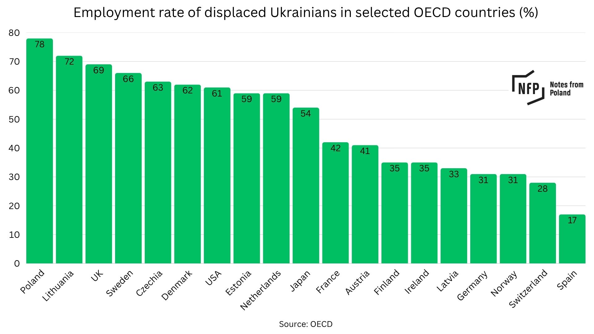 В Польше самый высокий уровень занятости украинских беженцев среди стран Организации экономического сотрудничества и развития (ОЭСР).